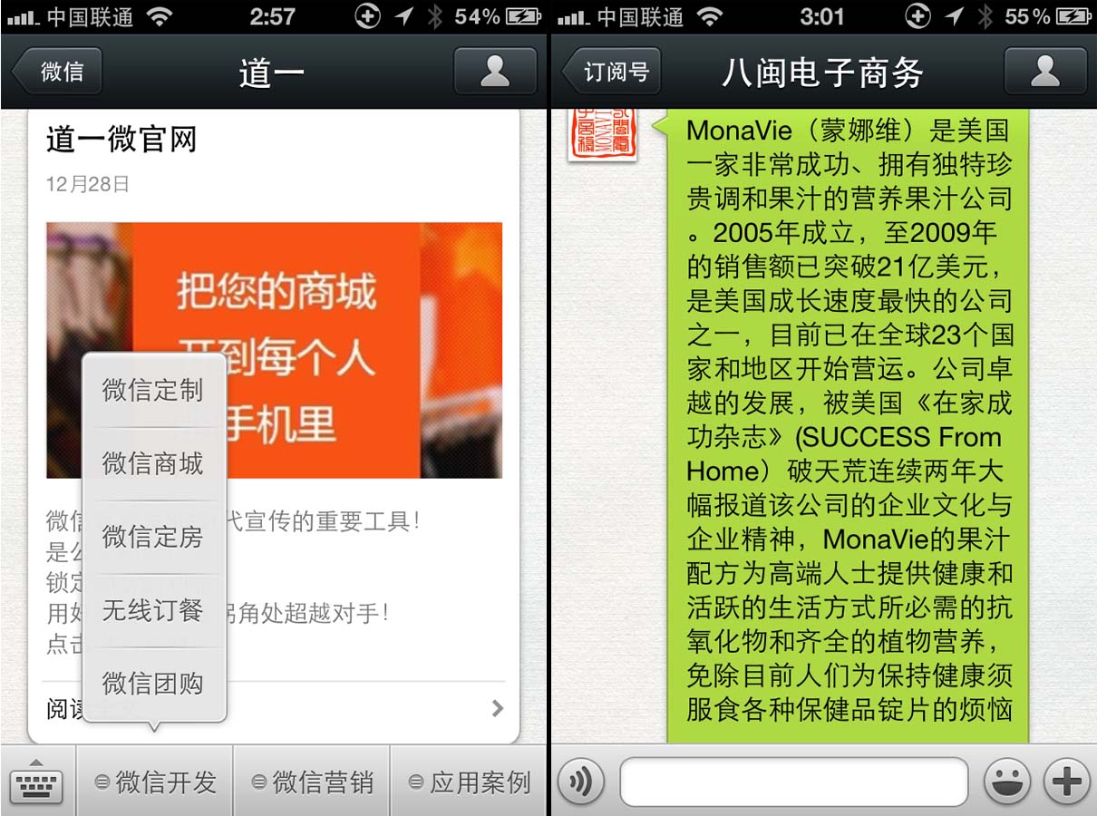 微信公眾平臺,利用公眾賬號平臺進行自媒體活動,簡單來說就是進行一對多的媒體性行為活動,商家通過申請公眾微信服務(wù)號通過二次開發(fā)展示商家微官網(wǎng)、微會員、微推送、微支付、微活動,微報名、微分享、微名片等,已經(jīng)形成了一種主流的線上線下微信互動營銷方式。